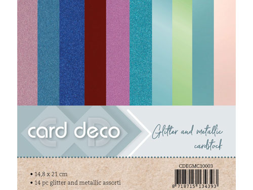 Deze verpakking bevat 4 vellen metallic karton (250 grams) en 10 vellen glitterkarton (230 grams) in verschillende kleuren. Formaat A5, inhoud 14 vel.